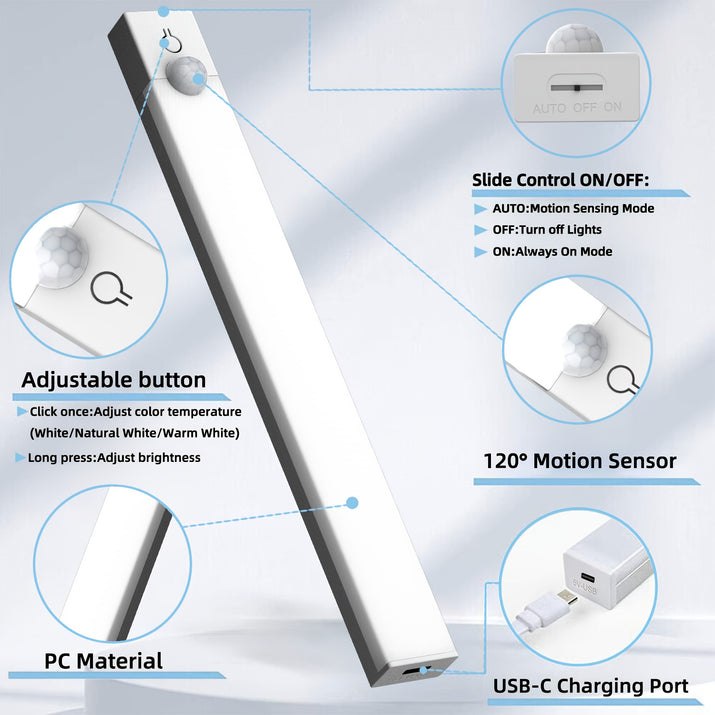 3-Pack: USB Rechargeable Smart LED Under Cabinet Lighting | Motion Sensor, 3-Color (3000K-4500K-6000K) and Dimmable